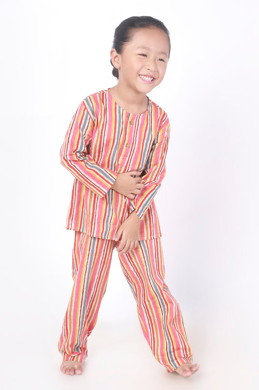 Mulitcolor Cotton Stripes Print Cotton Kurta Pyjama Nightsuit for Kids