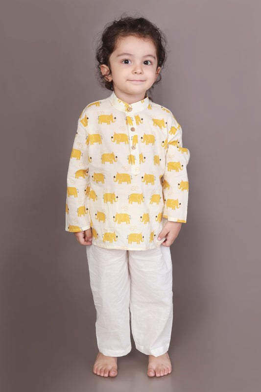 Yellow Elephant Print Kids Cotton Kurta & Pyjama Nightsuit Set