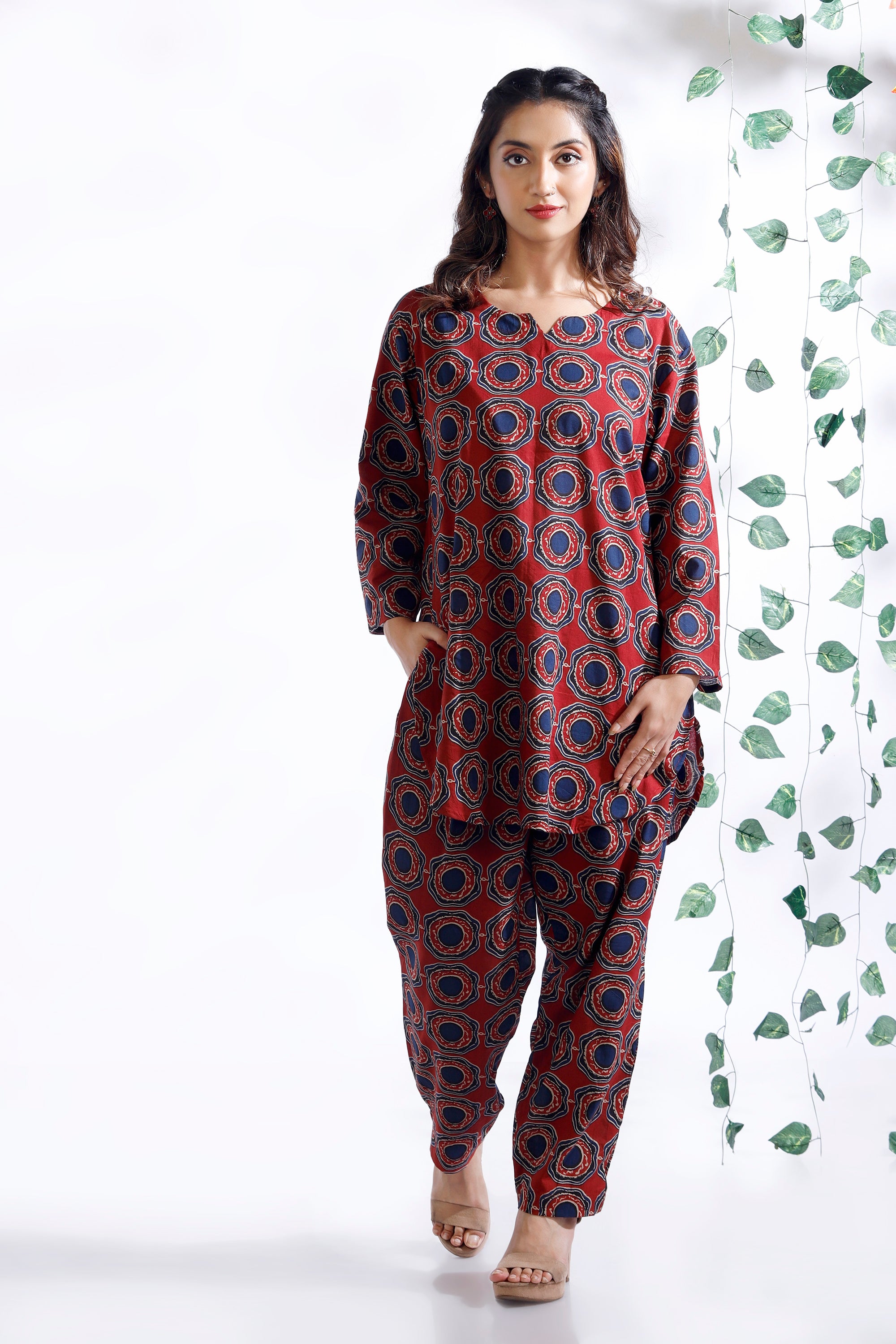 Wine Cotton Indian Motif Butta Loungewear Co-ord Set
