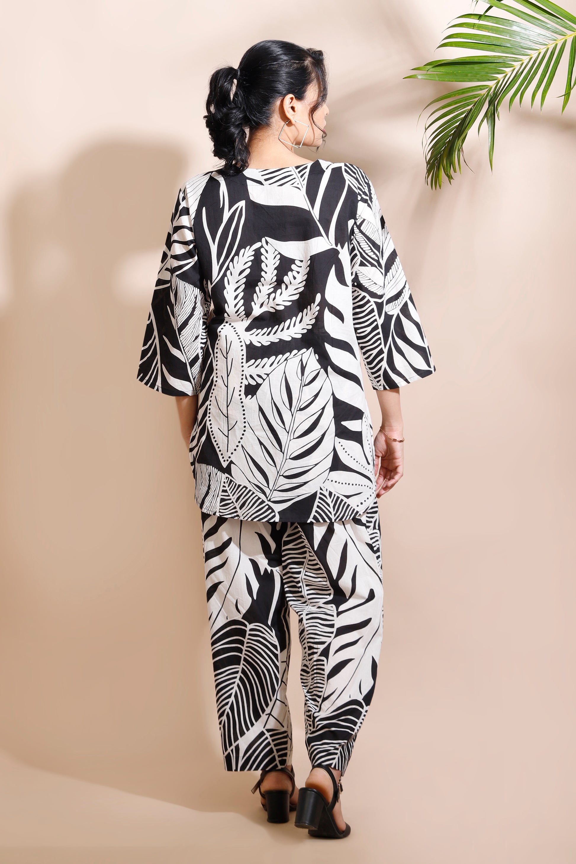Discover the perfect blend of comfort and style with the BREATH:ABLES women’s black cotton Nature print co-ord set. Crafted from breathable premium cotton, this versatile set includes a hip-length kurta with a relaxed silhouette, round neck, and 3/4th sleeves, paired with short narrow-bottom pants. The elasticated waistband with adjustable drawstrings ensures a custom fit, while the modern abstract print in timeless black makes it a chic choice for lounging, casual outings, or travel. Designed for effortless wear and easy care, it keeps its shape and colour wash after wash.